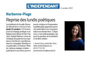PROCHAINE RENCONTRE :Le 13 OctobreLundi Poétique de Narbonne-Plage invitée Sophie Barbero, comédienne, auteur du conte philosophique L'Équinoxe